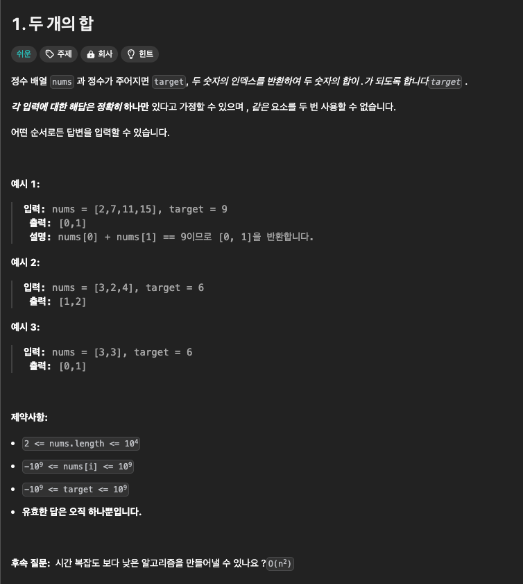 Grind 75를 통해서 처음으로 공부한 내용은 두개의 합을 구하는 배열의 문제였다.